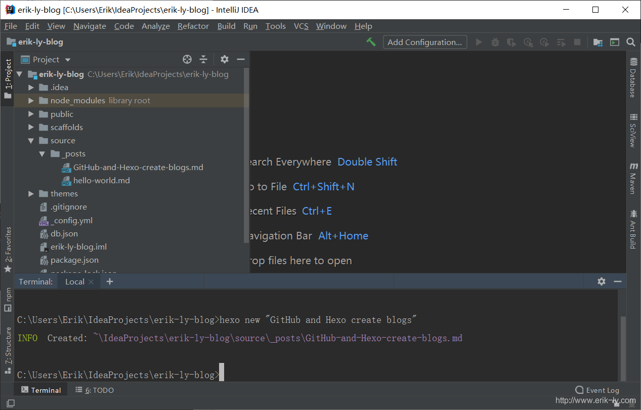 现在开始写第一篇文章,我这里为了方便使用,暂时使用 IDEA 打开项目并编辑文章,准备写第一篇文章,可以使用如下命令: