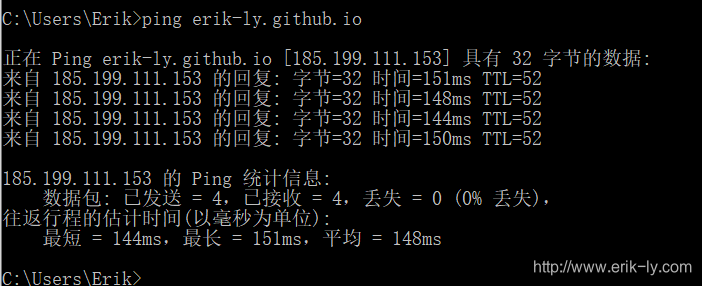 首先使用ping查看自己 GitHub 上用户名.github.io的 IP 地址,