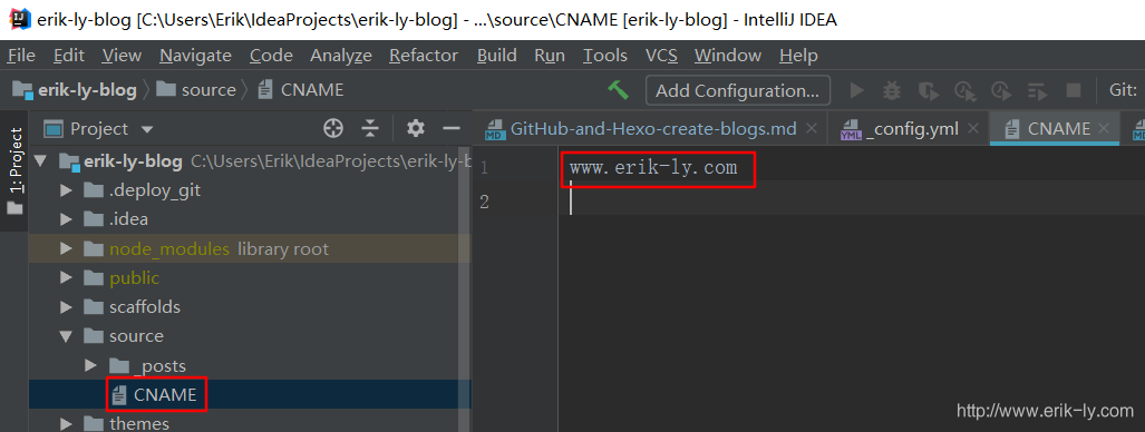 在 Hexo 文件夹的source目录下创建一个名为CNAME的文件,然后输入你的域名