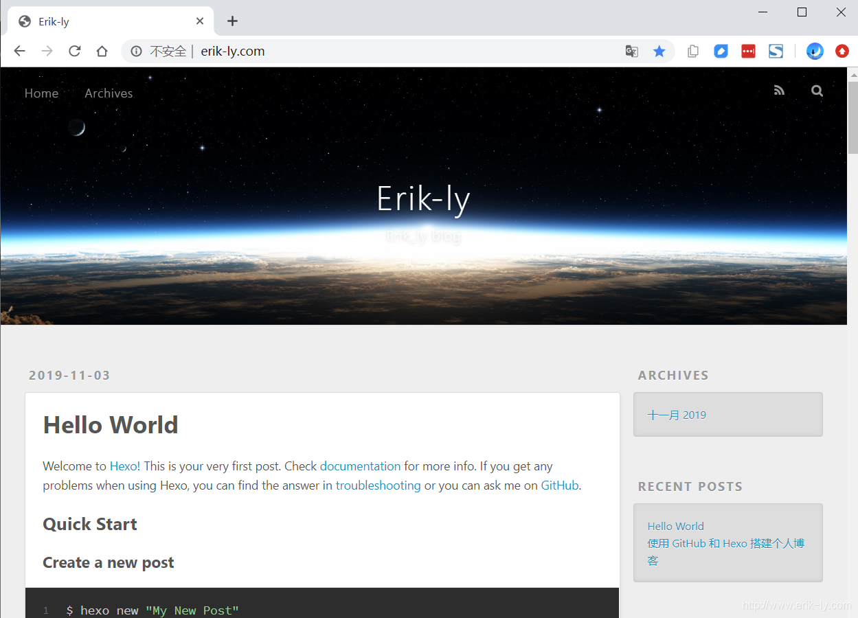 使用hexo d部署,然后访问网页查看效果,我这里是 http://www.erik-ly.com/