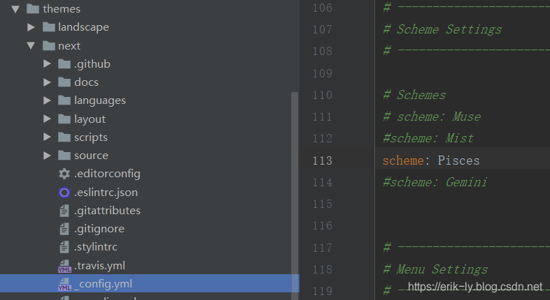 在 themes\next\_config.yml 的配置文件中设置 Next 主题的布局,有四种布局,可以分别尝试下,这里选择的是“Pisces”。